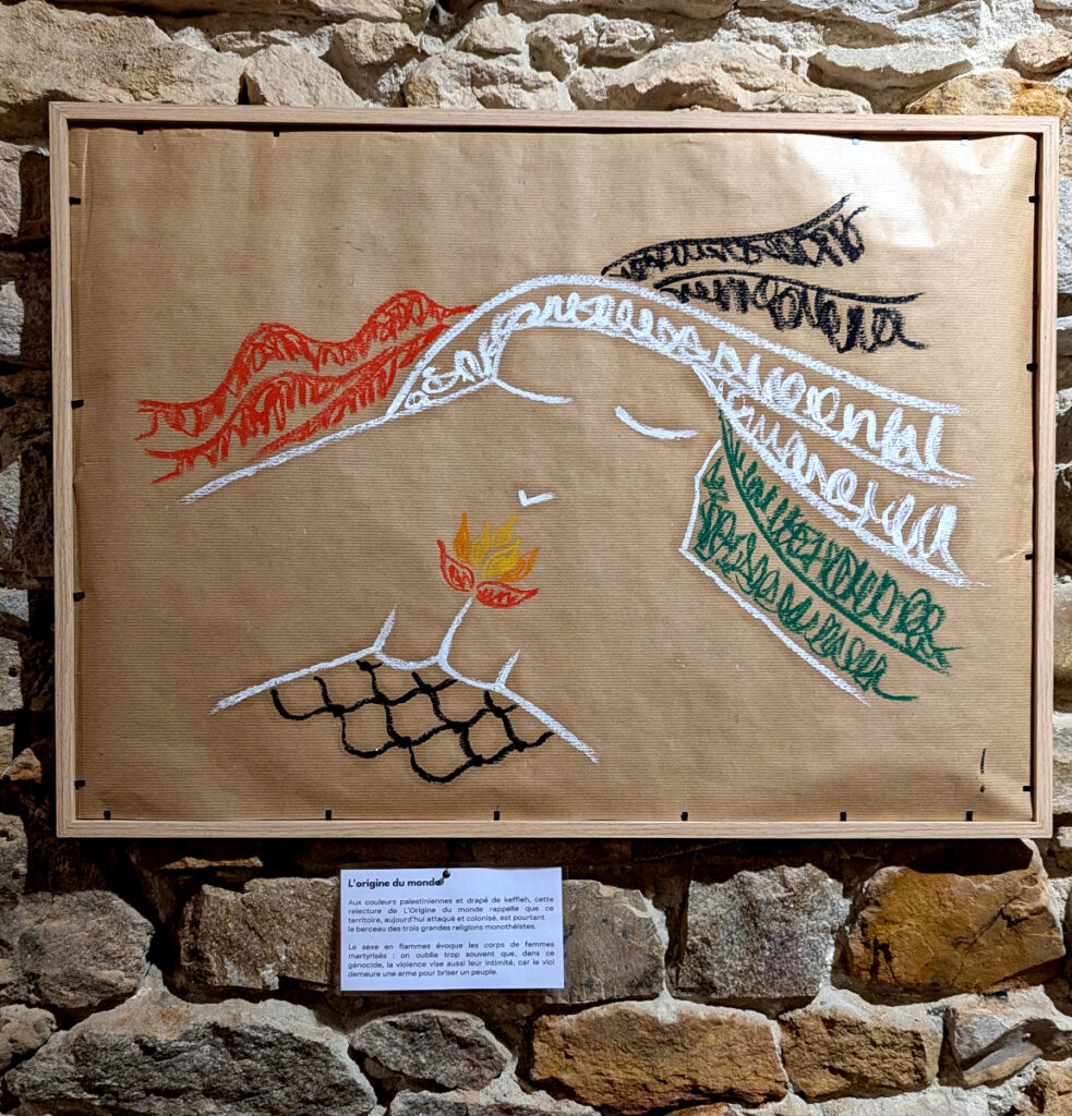 La première œuvre propose une réinterprétation contemporaine de Gustave Courbet, dénonçant les massacres et les violences sexuelles perpétrés en Palestine occupée.