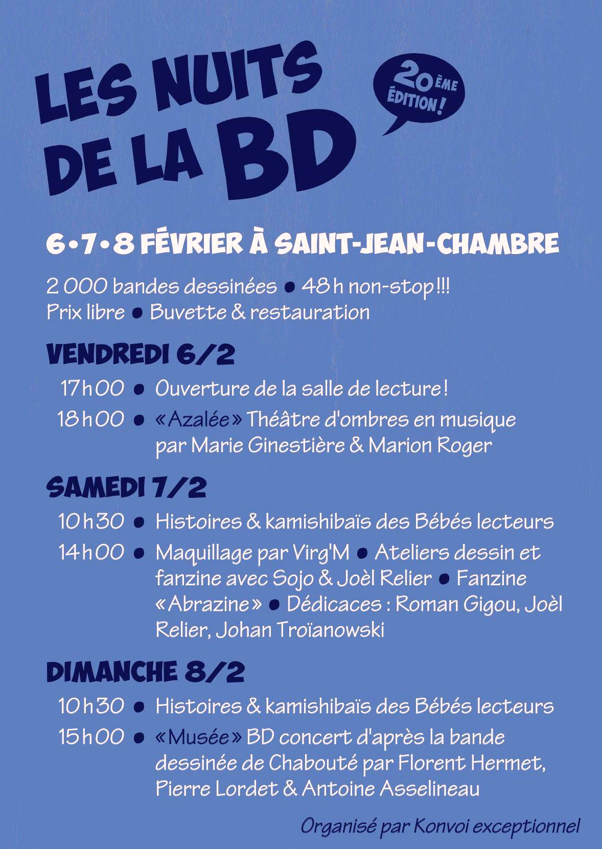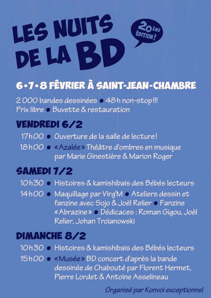 L’association Konvoi exceptionnel organise cette année encore Les Nuits de la BD ! Viendez nombreu·ses·x pour cette 20ᵉ édition qui se déroulera les 6, 7 et 8 février prochains !!!