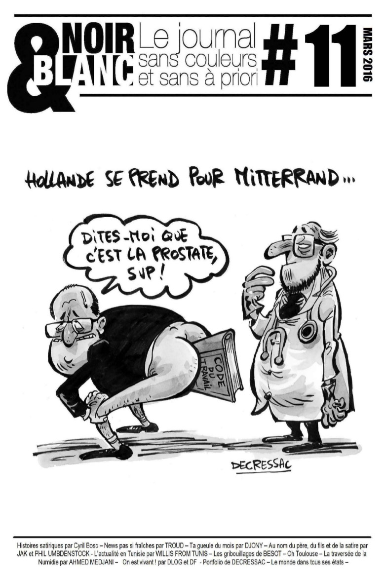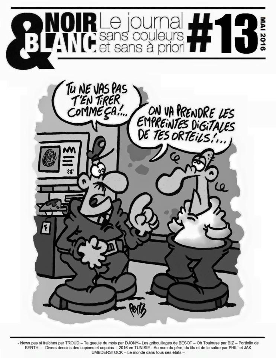 Pour cette première, nous vous proposons de découvrir le journal/fanzine de dessins satiriques Noir et Blanc, « le journal sans couleurs et sans a priori ». Né à Toulouse en 2015 à l’initiative de David, alias DF, le journal se veut iconoclaste, sans retenue, humoristique et sans a priori. Noir et Blanc réussit l’exploit de paraître et d’être diffusé chaque mois dans la région toulousaine avec un tirage non négligeable de 500 exemplaires. De nombreuses personnalités issues de l’univers du dessin de presse et de la caricature soutiennent et participent au projet (Willis from Tunis, Berth, Gab, Decressac, etc.).