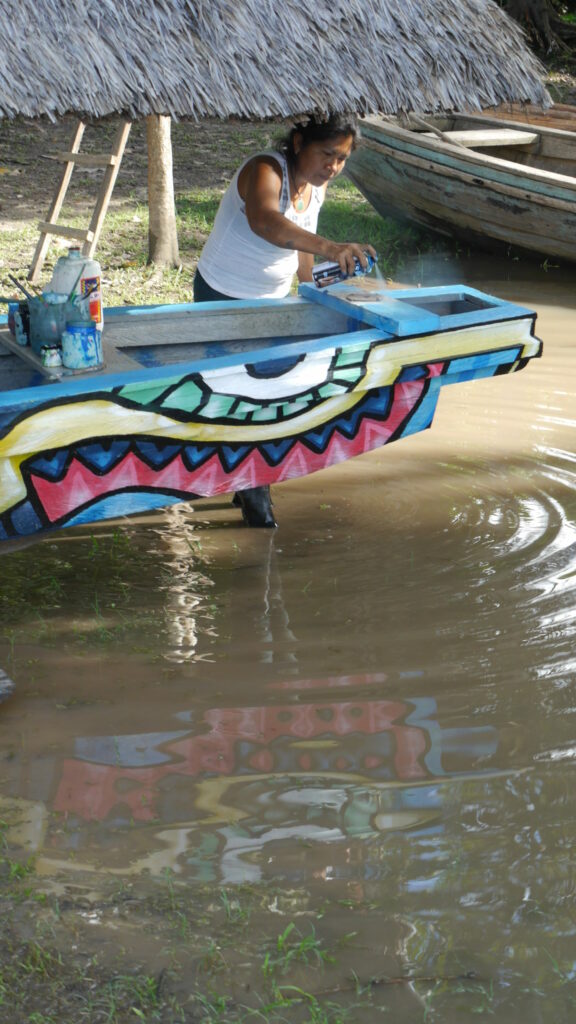 En résidence d’un mois à l’école de peinture « NYI » (qui signifie esprit aquatique en langue Tukano), j’ai pu monter un projet collaboratif avec les étudiants et habitants de Puerto Miguel. Ensemble, nous avons peint le bateau de l’école.